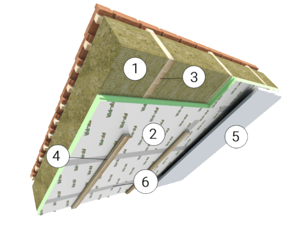 1 – Мінеральна вата; 2 – FF-PIR ALK; 3 – Крокви; 4 – Каркас для гіпсокартону; 5 – Гіпсокартон; 6 – Клейка пароізоляційна стрічка.